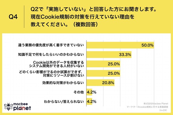 「Q4.現在Cookie規制の対策を行えていない理由を教えてください。(複数回答)」(n=24)と質問したところ、