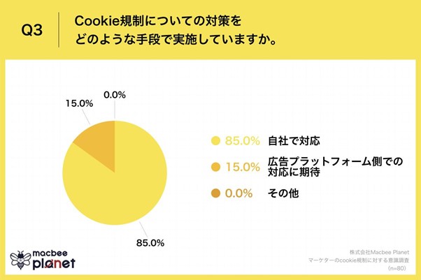 「自社で対応」が85.0%、「広告プラットフォーム側での対応に期待」が15.0%という回答となりました。
