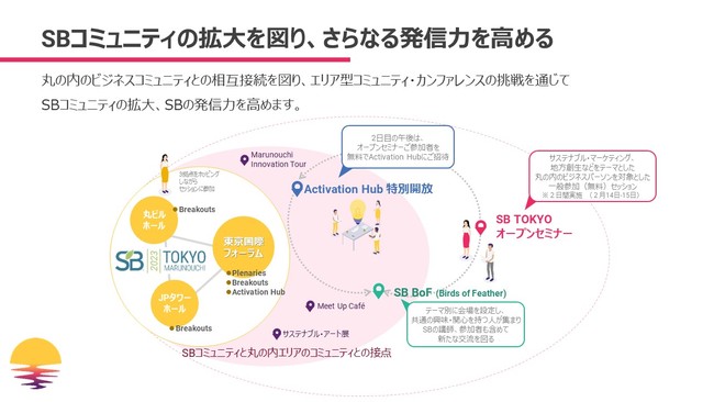 「SB'23 東京・丸の内」は、国内外の企業・団体・自治体等のサステナビリティに関する最新の取り組みや潮流を知り、各業界の第一線で活躍するイノベーターとネットワーキングができるアジア最大規模のエリア型のコミュニティ・カンファレンスです。