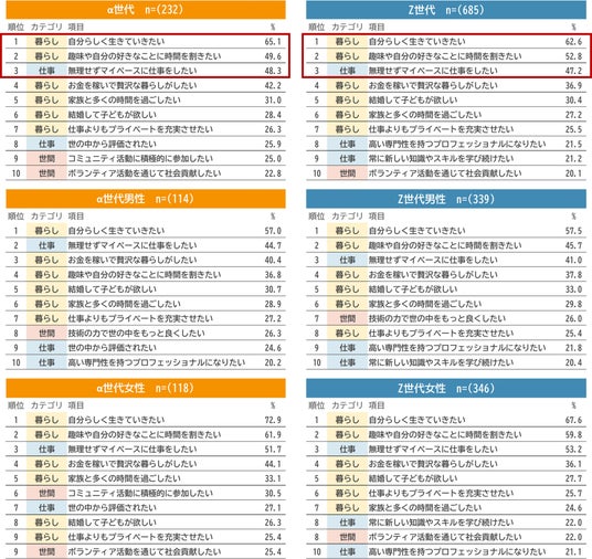 世代間の差はあまり見られず、TOP3は「自分らしく生きていきたい」「趣味や自分の好きなことに時間を割きたい」「無理せずマイペースに仕事をしたい」と