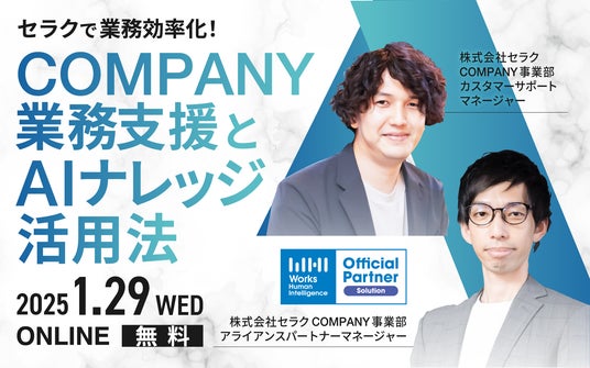 株式会社セラク(東京都新宿区、代表取締役:宮崎 龍己、以下当社)は、1月29日(水)に「セラクで業務効率化!~COMPANY業務支援とAIナレッジ活用法~」に関するオンラインセミナーを開催いたします。
