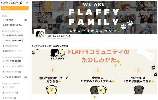 このたび、MURAコミュニティにてFLAFFYの公式ファンコミュニティを開設いたしました。愛犬家同士が気軽に繋がれる場所を提供することで、交流や情報交換を盛んにし、家族と愛犬が”もっと”わかりあえる世界を作っていきます。FLAFFYのコンセプトである“イヌとヒトの関係をフラットに”を体現する"日本最大の愛犬家コミュニティ"を目指してまいります。ぜひたくさんの愛犬家の方々にご参加いただけると嬉しいです。