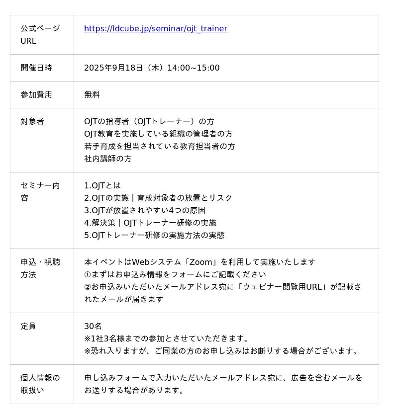 そのような中、本セミナーでは、多くの組織で起こりがちな課題解決に向け、OJTが放置されがちな理由とリスク、そしてその対策となるOJTトレーナー研修の実施方法について解説します。