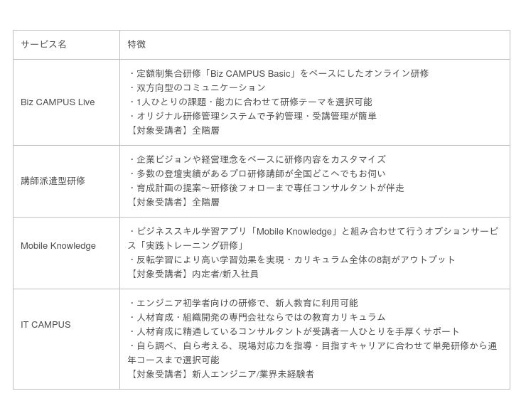 当社のライブ配信型オンライン研修には、階層別×スキル別に体系化された300以上の研修テーマの中から自由に選択できる定額制の研修「Biz CAMPUS Live」、企業ごとに強化したいテーマや受講環境を自由にカスタマイズできる「講師派遣型研修」があります。また、モバイル学習アプリ「Mobile Knowledge」と組み合わせて行う実践トレーニング研修も開催。さらに、IT特化のエンジニア初学者向け養成研修「IT CAMPUS」も開催しています。「IT CAMPUS」はテクニカルスキルと基礎力となるビジネススキルを同時に学べるのが特徴で、新入社員研修の一環としても広く活用いただいています。