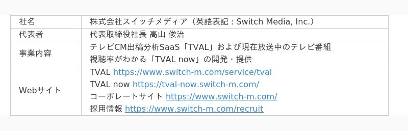 株式会社スイッチメディアは、国内最大規模のテレビ視聴パネルから独自に収集したテレビ視聴データを活用し、多面的な切り口の属性情報から設定したターゲットのテレビCMリーチ分析および購買データと連携したCMの売上効果の可視化を強みとしています。この強みを活かし、テレビCMとデジタル広告の統合マーケティングを最適化する広告出稿分析SaaS「TVAL」の開発・提供を行うほか、現在放送中のテレビ番組の視聴率をリアルタイムで把握できる「TVAL now」の開発・運営を行っています。
