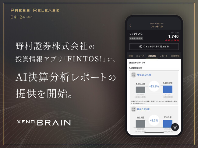 経済ニュースや統計データを独自のディープラーニングモデルで学習し、企業業績や製品市況、需給などの様々な経済状況を予測するSaaSサービス「xenoBrain」(ゼノ・ブレイン)を開発する株式会社xenodata lab.(本社:東京都台東区、代表取締役社長:関洋二郎、以下「ゼノデータ・ラボ」という)は、大手証券会社グループである野村ホールディングス株式会社(以下「野村HD」)の個人投資家向けの投資情報アプリ「FINTOS!」向けに、ゼノデータ・ラボの投資情報コンテンツであるAI決算分析レポートの提供を開始いたしました。