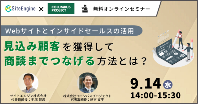 「自己表現にテクノロジーとアイデアを」を経営理念としてWebマーケティング支援サービスを提供するサイトエンジン株式会社(本社:東京都世田谷区 代表取締役:毛塚 智彦)は、2022年9月14日(火)14:00~15:30に、株式会社コロンバスプロジェクト(本社:東京都千代田区 代表取締役:緒方 文平)との” 【Webサイトとインサイドセールスの活用】見込み顧客を獲得して商談までつなげる方法とは?” を開催します。