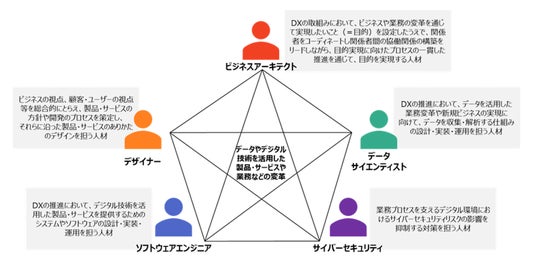 独立行政法人情報処理推進機構(IPA)および経済産業省が定めるデジタルスキル標準では、企業のDX推進に必要な人材として、1.ビジネスアーキテクト、2.データサイエンティスト、3.ソフトウェアエンジニア、4.デザイナー、5.サイバーセキュリティの5つの類型が定義されています。