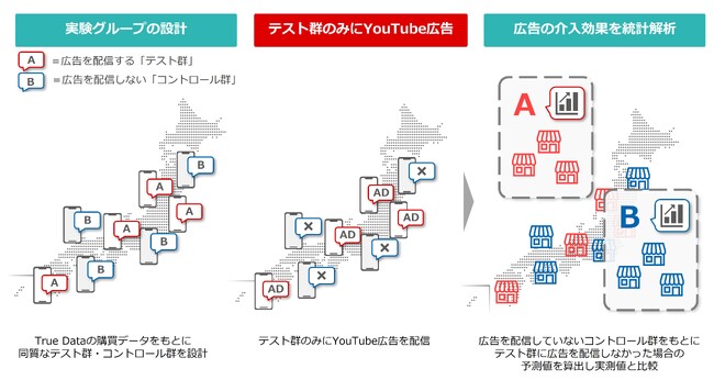 ■売上効果の検証プロセスについて売上効果の検証にあたっては、まず、日本全国の都道府県を、広告配信を実施する「テストグループ」と実施しない「コントロールグループ」に分けます。このとき、人口などのオープンデータと、True Dataの統計化した購買データを使って、両グループが同じような人口、同じような売上となるように設計し、検証する施策以外の要素を排除します。そしてテストグループにのみYouTube広告を配信し、True Dataの全国データによる実店舗の売上実測値と、Googleの統計モデルCausal Impactを使って導き出した「広告を実施しなかった場合の予測値」を比較することで、YouTube広告配信による実店舗での売上アップ効果を検証します。