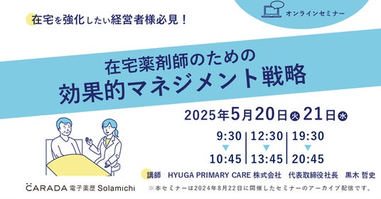 クラウド電子薬歴『CARADA 電子薬歴 Solamichi』の企画・開発・販売を行う株式会社ソラミチシステムは、昨年8月に開催した無料オンラインセミナー「在宅薬剤師のための効果的マネジメント戦略」を、ご好評につき5月20日(火)、21日(水) に無料で視聴可能なアーカイブ動画で公開します。