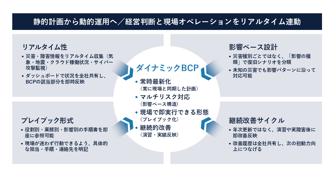 Dynamic BCP構築サービスは、業務とITの両面でRTO/RPOの整合や代替プロセスの明確化を行うことで実効性の土台をつくり、加えて、ダッシュボードによるリアルタイムの可視化、影響ベースの構造化設計、現場の迅速な行動を助けるプレイブック、演習による継続的な検証・改善を通じて、現場の即応力と経営の意思決定を結び、変化するリスク環境に適応する事業継続体制への刷新・定着を支援するサービスです。