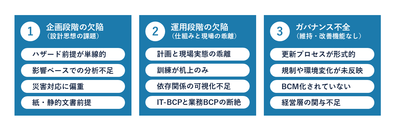 BCPが形骸化する主因は、設計・運用・ガバナンスの各段階に内在します。設計面では、地震中心の単線的ハザード前提に偏り、業務影響に基づくビジネス影響分析(BIA)が不足することでRTO/RPOや代替条件の具体化が不十分になります。運用面では、組織改編や人事異動後も連絡網や役割が更新されず、訓練が机上中心にとどまって初動・復旧のボトルネックが検証されないため、業務BCPとIT-BCPが断絶しがちです。ガバナンス面では、年次更新が形式化し、実際の障害事例や新たな規制・顧客SLAが反映されず、KPIの整備不備によりPDCAが回らないことが、BCPを“あるが動かない計画”へ押しやってしまいます。
