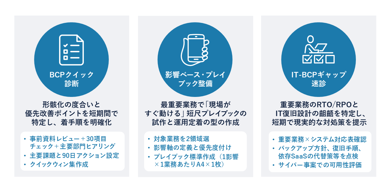 Ridgelinezでは、1か月程度で着手可能なクイックに提供できる「BCPクイック診断」「影響ベース・プレイブック整備」「IT-BCPギャップ速診」といった個別のコンサルティングサービスもご用意しています。