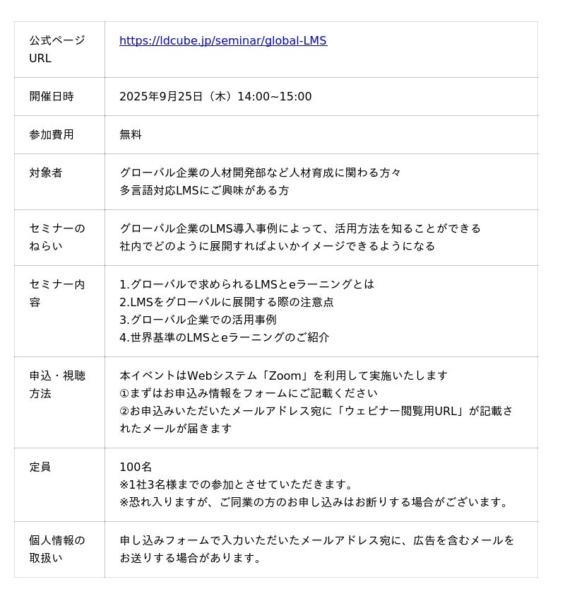 研修のスタイルにとらわれない企業向け人材育成サービスを提供する株式会社LDcube(本社:東京都千代田区、代表取締役社長:新井澄人、以下「当社」)は、「【海外拠点向け人材育成!】グローバル・多言語対応LMSを展開する際の課題と解決策!」と題してウェビナーを開催しますので、お知らせします。