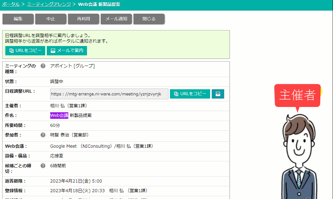 『NI Collabo 360』にはスケジュール管理機能と設備・備品予約機能があるため、主催者には自身と利用設備の空き時間が自動表示。その中から日程候補を選択するだけで、招待者に案内するWebアンケート形式の「日程調整ページ」が作成されます。招待者が希望日を選択するとアポイント日程が自動決定し、オンライン商談の場合にはWeb会議システム(Zoom、Microsoft Teams、Google Meet)との連携でWeb会議URLが自動発行されます。