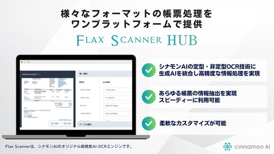 国内の大手企業へAI(人工知能)ソリューションを提供する株式会社シナモン(本社:東京都港区、代表取締役Co-CEO:平野未来/堀田創 以下、シナモンAI)は、AI-OCRと生成AIを統合し、企業におけるデータ活用を大幅に拡張するAI-OCRプラットフォーム「Flax Scanner HUB(フラックス・スキャナー・ハブ)」を、4月23日より販売開始します。