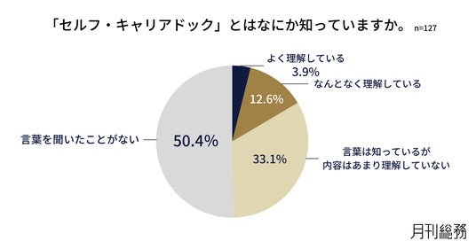 ◼️総務の半数が「セルフ・キャリアドック」を聞いたことがなく、実施率は1.6%にとどまる「セルフ・キャリアドック」とはなにか知っているか尋ねたところ、50.4%が「言葉を聞いたことがない」と回答しました(n=127)。