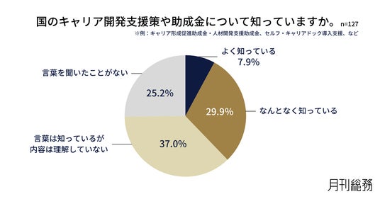 ◼️国のキャリア開発支援策や助成金、認知や活用は進まず国のキャリア開発支援策や助成金について知っているか尋ねたところ、「よく知っている」は7.9%にとどまりました。以前活用していたが、手間と時間掛かりすぎて効果的でないという声もありました(n=127)。