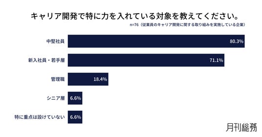 ◼️キャリア開発で力を入れる対象は「中堅社員」「新入社員若手層」。「シニア層」は進まずキャリア開発で特に力を入れている対象について尋ねたところ、「中堅社員」が80.3%で最も多く、「新入社員・若手層」が71.1%と続きました(n=76/従業員のキャリア開発に関する取り組みを実施している企業)。