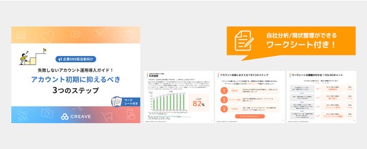 クリエイターとの共創を通じて企業のマーケティング課題を解決する、株式会社CREAVE(本社:東京都千代田区、代表取締役社長:中村真奈、以下 CREAVE)は、7月17日(水)に企業のSNS担当者向けお役立ち資料『失敗しないアカウント運用導入ガイド!アカウント初期に抑えるべき3つのステップ』を無料公開しました。