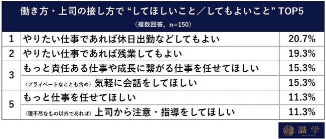 次に、新卒・若手社員は、働き方や上司の接し方について“してほしいこと/してもよいこと”といった“秘めた本音”はあるのでしょうか。お勤めの会社での働き方・上司の接し方について、あてはまる項目はあるか聞いたところ、「やりたい仕事であれば休日出勤などしてもよい」が20.7%、「やりたい仕事であれば残業してもよい」が19.3%という意見が上位に挙がりました。