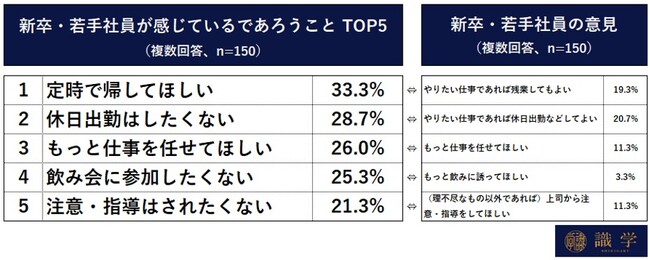 「新卒・若手社員が感じているであろうこと」について聞いてみると、「定時で帰してほしい」が33.3%、「休日出勤はしたくない」が28.7%で上位に挙がりました。新卒・若手社員の“秘めた本音” 「やりたい仕事であれば休日出勤や残業してもよい」といった意見とは逆の結果となりました。双方の意見が合致していたのは“飲み会”についてで、新卒・若手社員が「もっと飲みに誘ってほしい」3.3%だったのに対し、上司側も「飲み会に参加したくない(と新卒・若手社員は思っている)」25.3%でした。