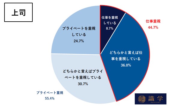 では実際に、“仕事”と“プライベート”では、どちらを重視しているのでしょうか。新卒・若手社員と上司の双方の視点で比較すると、新卒・若手社員は、仕事重視派(「どちらかと言えば仕事を重視している」を含む)24.7%、プライベート重視派(「どちらかと言えばプライベートを重視している」を含む)75.3%だったのに対し、上司は仕事重視派(「どちらかと言えば仕事を重視している」を含む)44.7%、プライベート重視派(「どちらかと言えばプライベートを重視している」を含む)55.4%と新卒・若手社員と比較して大きな差がありました。やはり、今の新卒・若手社員の多くはプライベートを重視しているようです。