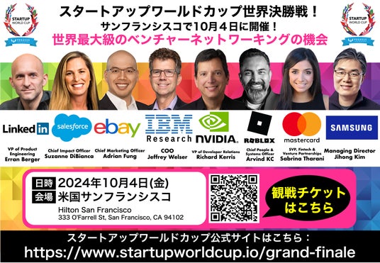 世界100以上の国と地域で予選を開催する世界最大級のビジネス・ピッチコンテスト「スタートアップワールドカップ2024」が、各国の予選を終え、いよいよ世界決勝戦が10月2日(水)から10月4日(金)の3日間で米国シリコンバレーにて開催されます!日本からは、東京・京都・九州の予選を見事、勝ち抜いた3社の代表企業が世界の舞台へ挑戦します。また、世界決勝戦のステージには、IBM ResearchのCOO、話題のNVIDIAや、Web3で著名なROBLOXの開発トップをはじめ、Salesforce、eBay、 Mastercard、 サムスン、LinkedInなどトップ企業のイノベーションの立役者たちが登壇するなど豪華コンテンツが目白押しです。また、シリコンバレーを牽引するトップティアのベンチャーキャピタルのSequoia Capital、Lightspeed、NORWEST、NEA、B Capitalの著名なパートナーの方々が審査員を務めます。トップベンチャーキャピタリスト約200名、スタートアップは約1,000社、大企業のCVC関係者300社以上の合計3,000人以上が集まります。業界をリードするスタートアップ やイノベーションのプロフェッショナルとのネットワークを構築する絶好の機会です!今、注目されるAIやバイオテックなどの最前線のテクノロジーと知見に直に触れ、世界をリードするイノベーターたちとつながり、新たなコラボレーションの可能性と事業アイディアを広げる貴重な機会です。日本からのご参加を心よりお待ちしております!