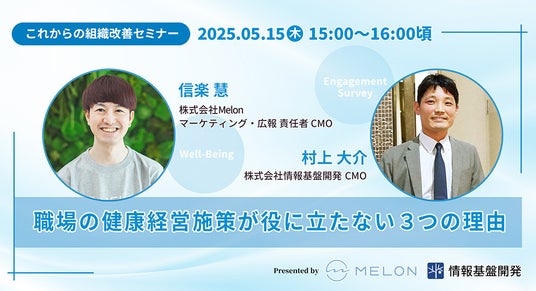 マインドフルネスを応用して人・組織の「心と感情の課題」解決を支援する株式会社Melon(本社:東京都港区、代表取締役CEO:橋本大佑、以下「MELON」)は、2025年5月15日(木)、株式会社情報基盤開発との共催で、「職場の健康経営施策が役に立たない3つの理由」をテーマにした人事労務・健康経営ご担当者向けオンラインセミナーを開催いたします。