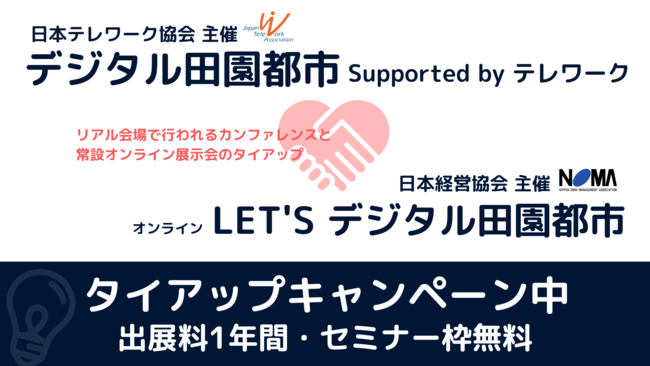 11月4日(金)に日本テレワーク協会が主催するリアルカンファレンス「デジタル田園都市Supported byテレワーク」とのタイアップイベントキャンペーンを実施いたします。「デジタル田園都市Supported byテレワーク」の有料パートナー(スポンサー)企業・団体にお申込みいただくと、「LET’S デジタル田園都市」の出展料1年分と出展者セミナー2枠分(総額20万円)を無料提供いたします。