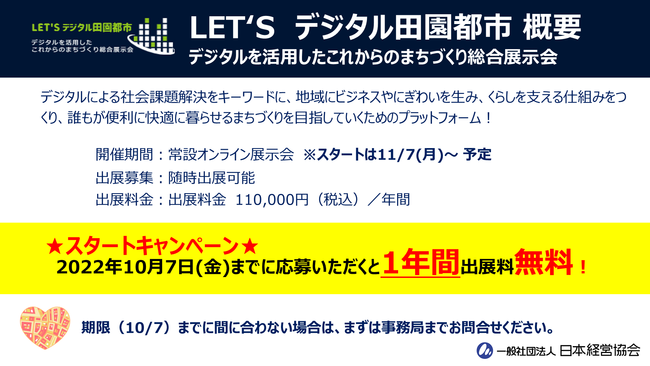 常設オンライン展示会「LET’S デジタル田園都市」の開催を記念して、2022年10月7日までの出展申込で出展料(11万円)が1年間無料となるキャンペーンを実施します。