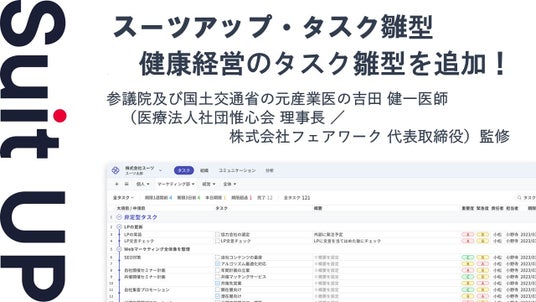 株式会社スーツ(所在地:東京都千代田区、代表取締役社長CEO:小松 裕介)は、チームでかんたん、毎日続けられるプロジェクト・タスク管理ツールの経営支援クラウド「Suit UP」(スーツアップ)において、参議院及び国土交通省の元産業医である吉田 健一医師(医療法人社団 惟心会 理事長/株式会社フェアワーク 代表取締役)が監修する健康経営のタスク雛型を追加したことをお知らせします。