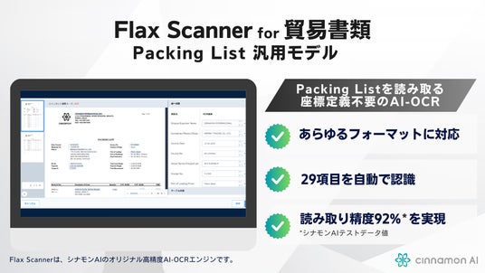 国内の大手企業へAI(人工知能)ソリューションを提供する株式会社シナモン(本社:東京都港区、代表取締役Co-CEO:平野未来/堀田創 以下、シナモンAI)は、当社オリジナルの高精度AI-OCR「Flax Scanner」において、世界中で幅広く使用されながらも、国や企業ごとにフォーマットが異なる貿易書類のPacking List(P/L 包装明細書。貿易書類の1種。)向けに、使用頻度の高さや優先度などで整理した29項目を自動認識してテキストデータを抽出する「Flax Scanner for 貿易書類 Packing List汎用モデル」を、5月14日より販売します。