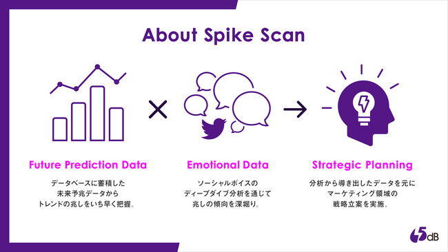 SNS上のソーシャルボイスを分析し、企業のマーケティング支援を行う「65dB TOKYO」は、このように著しく変化している社会状況を踏まえ、未来予兆データとソーシャルボイス分析を融合させた新サービス「Spike Scan」を開発いたしました。日本、パリ、中国など世界各国50社以上の企業課題を分析したグローバルメソッドに加え、世の中の話題量の変化を表す波形「スパイク」の兆候を、過去のSNSデータとトレンド予兆ツールと掛け合わせることにより、中長期的なトレンドになりうる「兆し」を早期に発見することすることが可能になります。「Spike Scan」の分析から導き出したデータを元に、65dBにしかできないマーケティング支援サービスを提供していく予定です。