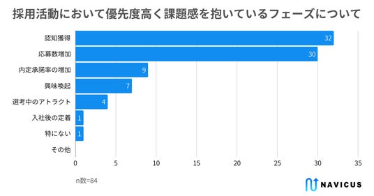 【参加者アンケート】採用活動において優先度高く課題感を抱いているフェーズでは「認知獲得」「応募数増加」が上位に