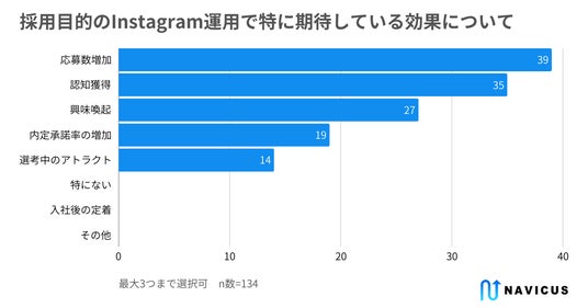 特に期待している効果について最大3つの複数回答で聞いたところ、「応募数増加」「認知獲得」が多くなり、次いで「興味喚起」となりました。採用活動において抱いている課題感を改善する手段のひとつとして、Instagram運用が行われていることがわかります。