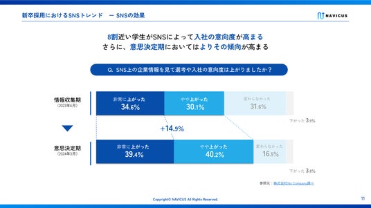 そのほか、現時点では実感できている効果が特にないという声も多かったですが、別の調査では、新卒採用において6割以上の学生が就職活動でSNSを利用しており、その中の8割近い学生が「SNSによって選考や入社の意向度が高まった」という結果も出ています。*1