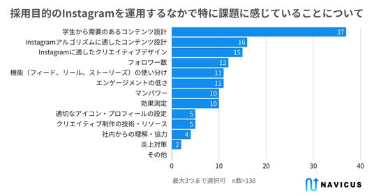 採用目的のInstagramを運用するなかで特に課題に感じていることを最大3つの複数回答で聞いたところ、「学生から需要のあるコンテンツ設計」が最も多くなり、次いで「Instagramアルゴリズムに適したコンテンツ設計」となりました。