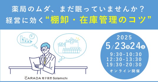 クラウド電子薬歴『CARADA 電子薬歴 Solamichi』の企画・開発・販売を行う株式会社ソラミチシステムは、株式会社ファルモの岸野 友紀氏を講師に迎え、無料オンラインセミナー「薬局のムダ、まだ眠っていませんか?経営に効く“棚卸・在庫管理のコツ” 」を5月23日(金)、24日(土) に開催します。