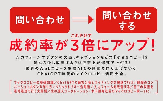 本書は、Amazon、Facebook、Googleなどの急成長を支えた技術と言われる、最強の一言となるWebコピーライティング=「マイクロコピー」の基礎から、AI時代の初心者でも大手代理店に勝つ技術「誰でも驚くほど早く簡単に売り上げを伸ばすことができる方法」を世界各国のウェブサイトから優れた事例とともに解説。ChatGPTなどのAIツールと組み合わせて、より効率的にアイディアを出す方法など、マーケッター・経営者・コピーライター必読の一冊です。