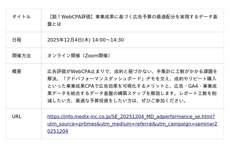 株式会社メディックス(本社:東京都千代田区、代表取締役:田中 正則)は、広告データ、Web解析データ、そして顧客が保有する事業成果(成約・リピート購入など)データを自動で統合し、広告の費用対効果を事業成果で可視化する新サービス「アドパフォーマンスダッシュボード」をリリースしました。本サービスは、従来のWeb上のCPA(顧客獲得単価)評価から脱却し、ビジネスの最終成果に基づく本質的な広告最適化を支援します。
