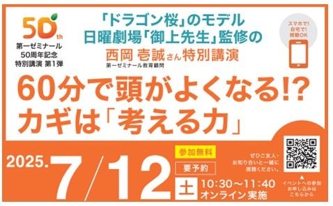 教育を軸としたサービスを展開する総合教育サービス企業の株式会社ウィザス(本社:大阪府大阪市、代表取締役社長:生駒 富男)が運営する、第一ゼミナール(本社:大阪府大阪市)は、創業50周年を記念し、特別講演イベントを開催いたします。講演には、偏差値35から東大合格を果たし、漫画・ドラマ『ドラゴン桜』のモデルで日曜劇場『御上先生』監修の西岡壱誠氏を迎えます。