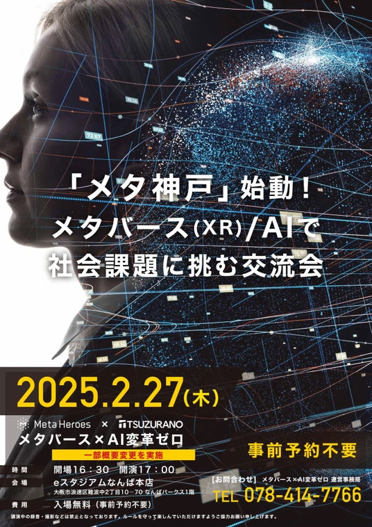 株式会社Meta Heroes(本社所在地:大阪府大阪市、代表取締役:松石和俊、以下「当社」)とツヅラノフロンティア株式会社(本社所在地:兵庫県神戸市、代表取締役:黒葛野勇斗、以下「ツヅラノフロンティア」)は、2025年2月27日(木)に共同でセミナー「メタバース×AI変革ゼロ」を開催いたします。