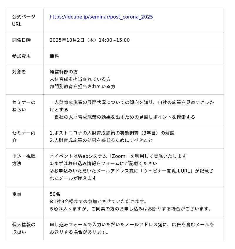 研修のスタイルにとらわれない企業向け人材育成サービスを提供する株式会社LDcube(本社:東京都千代田区、代表取締役社長:新井澄人、以下「当社」)は、「【2025年調査レポート速報】調査から見る!人財育成施策の効果を上げるポイント!」ウェビナーを開催しますので、お知らせします。