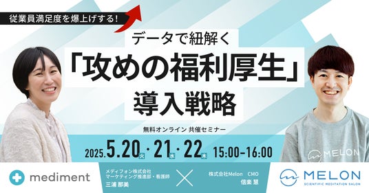 株式会社Melonは、2025年5月20日(火)から5月22日(木)の3日間、株式会社メディフォンとの共催で、「従業員満足度を爆上げする!データで紐解く『攻めの福利厚生』導入戦略」をテーマにした人事労務・健康経営ご担当者向けセミナーをオンラインで配信いたします。