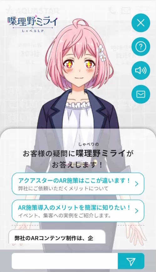 株式会社アクアスター(本社:東京都中央区、代表取締役社長 原田弘良)は、独自に開発したインタラクティブAIチャットボット「しゃべるLP喋理野ミライ」を発表します。