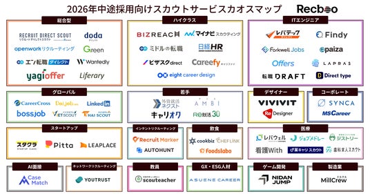 スタートアップ企業向け中途採用支援サービス「Recboo(リクブー)」を提供する株式会社ノックラーン(本社:東京都大田区、代表取締役:福本英、以下ノックラーン)は、中途採用市場における媒体選定を支援するため、「2026年中途採用向けスカウトサービスカオスマップ」を公開しました。