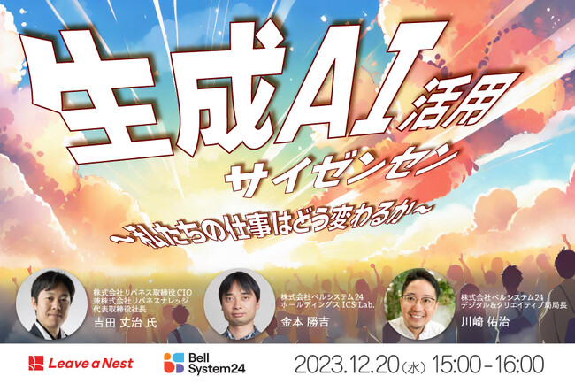 株式会社ベルシステム24(本社:東京都港区、代表取締役 社長執行役員:野田 俊介、以下:当社)は、実務における生成AI活用のトレンドをテーマとした「生成AI活用サイゼンセン~私たちの仕事はどう変わるか~」と題したオンラインセミナーを、12月20日(水)に開催します。