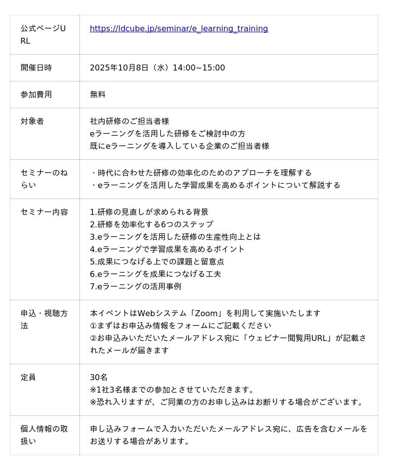 研修のスタイルにとらわれない企業向け人材育成サービスを提供する株式会社LDcube(本社:東京都千代田区、代表取締役社長:新井澄人、以下「当社」)は、「【研修の最適化】eラーニングを活用したデジタル時代の人材育成の新しい形」と題してウェビナーを開催しますので、お知らせします。