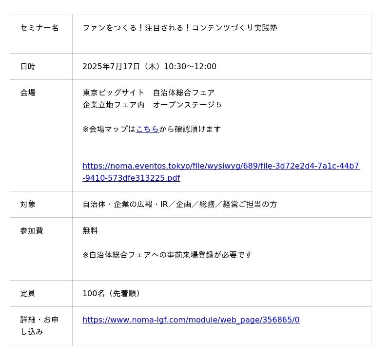 一般社団法人日本経営協会(本部:東京都渋谷区、会長:高原 豪久)は、2025年7月17日(木)10:30~12:00、東京ビッグサイトにて、自治体・企業の広報担当者向け特別セミナー「ファンをつくる!注目される!コンテンツづくり実践塾」を開催いたします(※自治体総合フェア2025内オープンステージ5にて実施)。